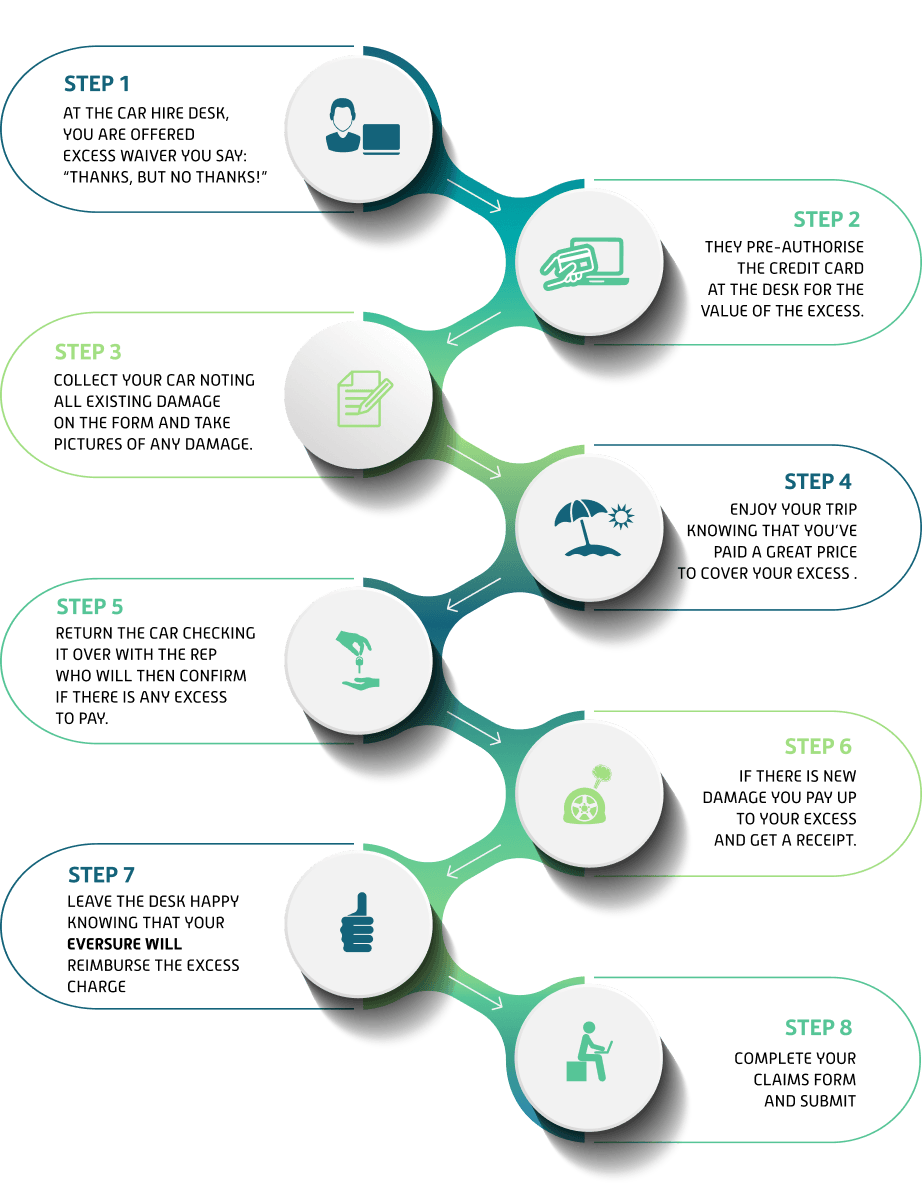 Buy a rental excess policy for as little as €6.19 a day. If you need to claim, you pay the car rental company’s deductible or excess and then claim it back through us, saving you money in the process.